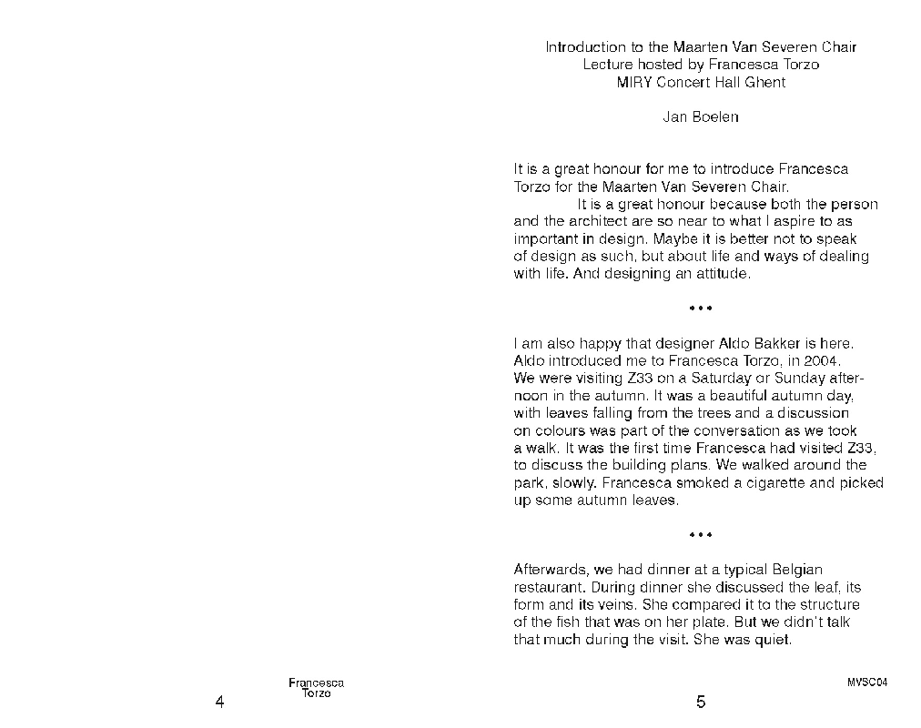 Francesca Torzo (1975) is an Italian architect-maker; an architect who creates architecture in a sensory way. She studied architecture in Delft, Barcelona, Mendrisio and Venice [IUAV]. She worked for architect Peter Zumthor and Bosshard Vaquerarchitekten, Zurich. In 2008 she started her own architectural practice in Genoa. She designed and built – to name a Belgian project – the recent expansion and renovation of Z33 in Hasselt.
